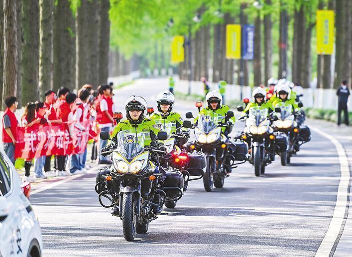 警用摩托车为汉马运动员开道,成为东湖绿道亮丽的“警”色。 (湖北日报全媒记者 朱熙勇 摄)