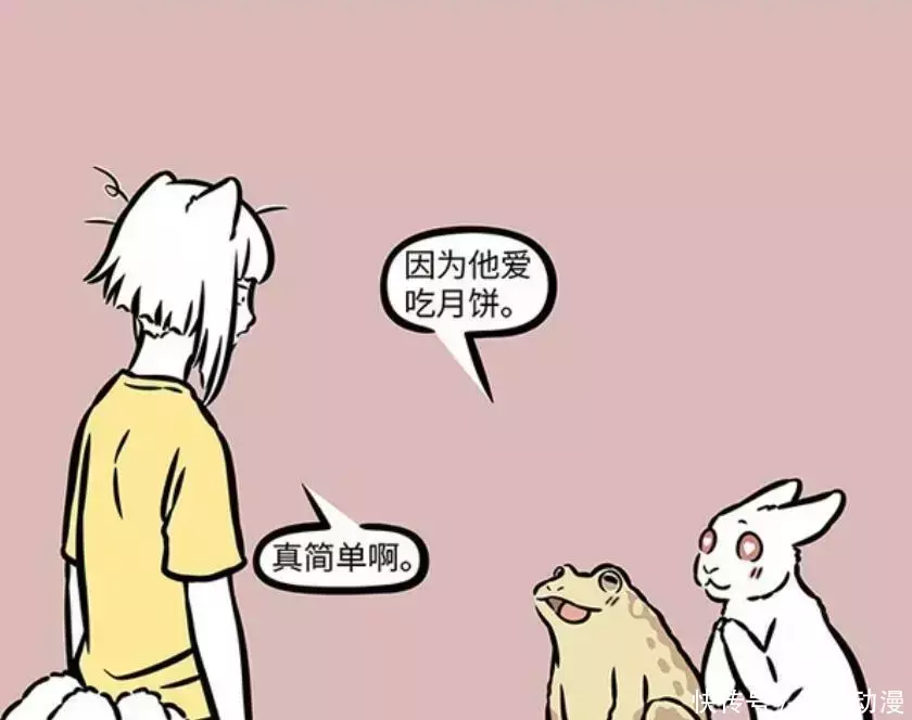 还有一只玉兔,在八千万只玉兔里面属于特殊个体,它是唯一喜欢吃月饼的玉兔。不仅如此,这只玉兔还跟没有毒的金蟾在一起。原本这种事情不会被小玉和金蟾所认可,但因为九月的一番说辞,最终他们不仅顺利结婚,就是费用都由小玉和金蟾出。